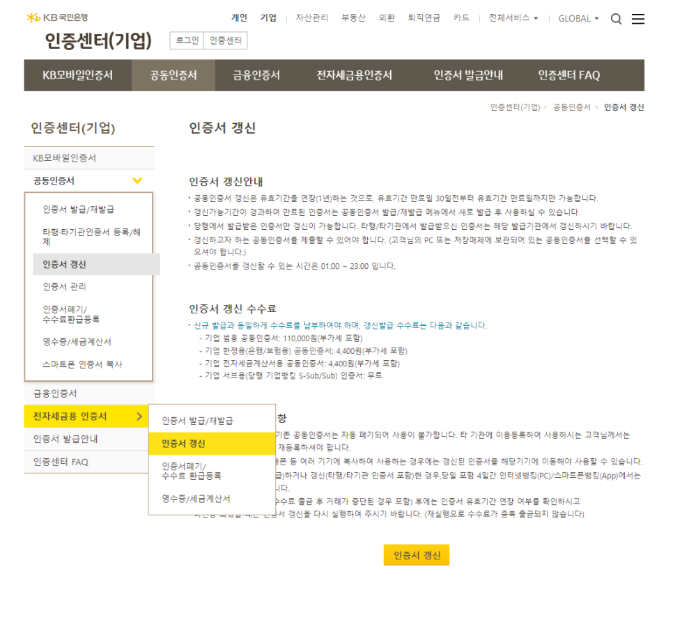 국민은행이 아닌 우리은행, 신한은행 등 타 은행에서도 공인인증센터에서 기업으로 들어가신 후 위 경로처럼 갱신을 하시면 간단하게 갱신하실 수 있으니 참고하시면 좋겠습니다.